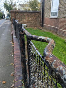 The little dent at the ends of the railings tell us that these railings were once stretchers used in WW2. Amazing but true. Railings were removed for the war effort as the metal was needed, and at the end of the war, it cost too much to replace the railings, but there were many stretchers left over, and they were repurposed as railings. More information on these can be found here and here.